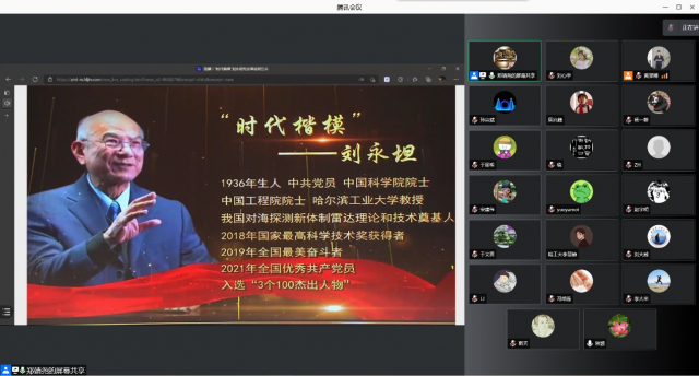 2021年10月29日晚,黑龙江省委宣传部和永利官方网站联合举办了“时代楷模”刘永坦先进事迹报告会,机电学院院办机关党支部以线上和线下相结合的方式组织院办全体教职工参与观看,其中机电学院党委副书记吕焱和学院全体辅导员于机械楼1024线下观看,其他教职工通过腾讯会议平台线上观看。