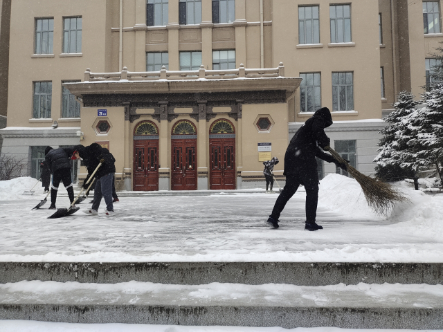 中午十二点半,课程结束的同学们或是在热气腾腾的食堂品味佳肴,亦或是惬意地躺在寝室中休息。而青年志愿者们不畏严寒,冒着飕飕袭来的寒风,于机械楼门前开展了此次扫雪活动。在青协工作人员的引导下,志愿者们领取了扫雪工具,分四组对8号楼前广场、机械楼前广场、机械楼两侧的小路以及校车站点开展清扫活动。银装素裹之中,同学们积极主动、相互配合、齐心协力,挥舞着手中的铁锹和扫帚,你铲我扫,一派热火朝天的景象。尽管志愿者们的脸庞在寒风中都冻得通红,但他们手中的工具却始终没有放下。“规格严格,功夫到家”的校训处处彰显,扫雪活动也不例外。每一处雪堆,哪怕结成了坚冰,在志愿者们扎实的功夫面前也只能乖乖束手就擒。吃苦耐劳、求真务实,铲除的一堆堆雪堆,见证着工大学子的团结奋进;同学们脸上洋溢的幸福微笑,让路旁的行人感受到无比的温暖。一小时的奋战,志愿者们虽然浑身是汗,却因自己的贡献与阿姨们的称赞和感谢而感到愉快充实。在一片欢声笑语之中,机械楼门前大片区域的积雪全部被清扫干净,给前来上课的师生带来了便捷、安全、温暖与满满的正能量。