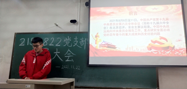 2021年11月22日晚6点30分,机电学院21S0822党支部在正心楼318召开党员转正大会,并开展主题党日活动——贯彻学习党的十九届六中全会精神。会议由21S0822党支部书记曹咸鉴同志主持,党支部所有党员和部分入党积极分子同志出席了此次党日活动。