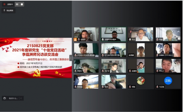 活动第二项,党支部与蔡鹤皋院士进行了线上交流,蔡院士回顾了自己的青年生涯,表示哈工大的初心和使命就是为国家建设输送又红又专的高水平人才,助力建设社会主义现代化强国,把国家从一个制造大国转变为一个制造强国。同时还对支部党员提出了三点寄语:首先,在学习阶段要打好基础,不断积累。其次,以后在工作岗位上也要坚持学习,多动脑筋。最后,不但要思想好,还要身体好。艰巨的学习任务需要一个强健的身体,要有一个自己热爱的体育活动。