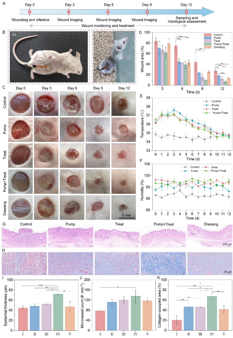 为实现慢性伤口的高效治疗,团队设计并制作了可同时实现伤口渗出液管理和按需治疗的智能可穿戴医疗设备。在此项工作中,智能伤口敷料可贴附在伤口点,伤口渗出液会自发地泵送到微流体通道进行存储。同时,智能伤口敷料可通过监测伤口的温度和湿度信息来判断是否为早期感染,通过智能手机反馈、控制液态金属加热器,使水凝胶中药物按需释放,从而实现慢性伤口的闭环反馈治疗。在小鼠感染创面模型中,多功能伤口敷料通过减少炎症反应、促进血管生成和胶原沉积来加快伤口愈合速度。