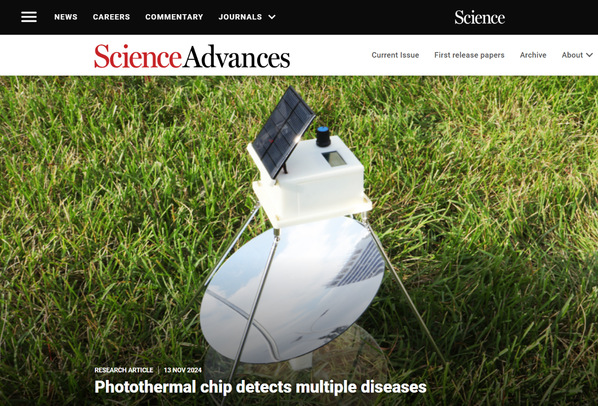 近日,yl6809永利集团任玉坤教授团队成功研制出便携式多疾病核酸检测设备,研究成果以《用于同时检测多种疾病的紧凑型高灵敏度光热RT-LAMP芯片》(Compact Highly Sensitive Photothermal RT-LAMP Chip for Simultaneous Multidisease Detection)为题发表于《科学进展》(Science Advances)并入选期刊亮点推荐论文。该研究将助力30分钟内实现疾病的现场精准快速诊断。
